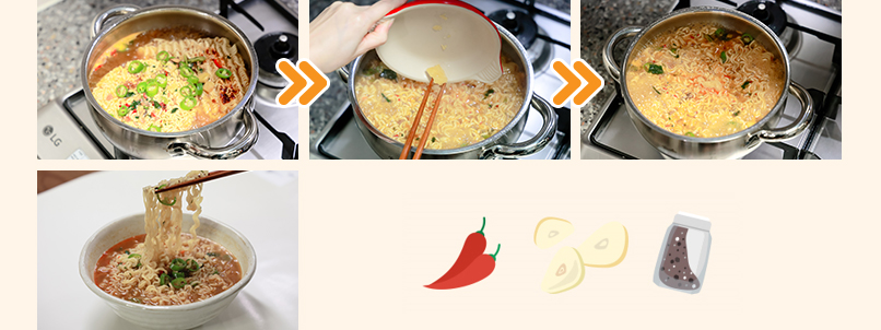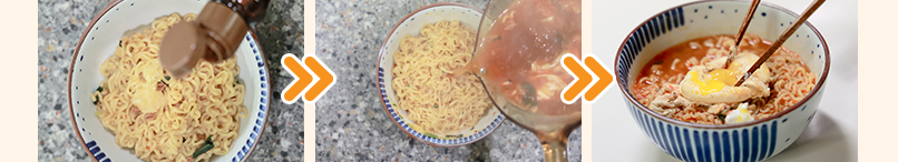 ④ 그때 불을 끄고 비빈 면 위에 국물과 계란을 부어주세요. 먹기 직전 후추 톡톡은 취향껏!