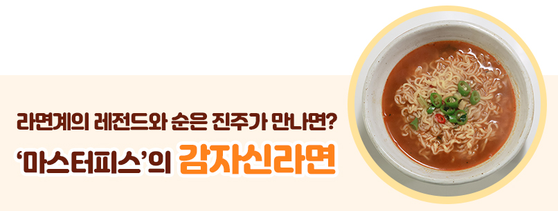 두 번째 레시피는 닉네임 ‘마스터피스’님이 추천해주신 신라면과 감자면의 콜라보입니다. “쫄깃한 감자면의 전분기가 국물을 살짝 진득하게 해 진국으로 만들어버려요. 샤브샤브 국물 맛과 신라면 매운맛의 하모니~”라고 추천해주셨는데요. 닉네임 ‘인생을맛있게’님도 두 라면의 조합을 추천하며 “신라면의 고급화, 감자면의 재발견”이라고 짧고 강한 한 줄 평을 보내 주셨습니다.